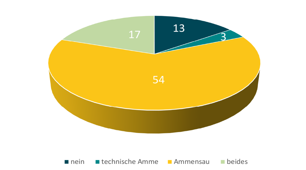 Die Frage, ob ein Ammensystem zum Management im Abferkelstall gehört, beantworteten 87 Teilnehmende, wobei der größte Teil der Befragten Ammensauen einsetzt (Abb. 2).
