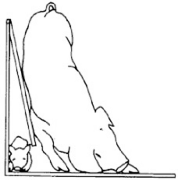 An den Buchtenwänden in Bodennähe angebrachte Metallrohre dienen weniger als Abliegehilfe, sondern eher als Abweisbügel (Abb. 34 und 35). Sie steuern das Liegeverhalten der Sauen indem sie das Liegen an der entsprechenden Wand unbequem machen. 28 Beim Abliegen an einem Rohr entsteht eine sehr hohe Punktbelastung an der entsprechenden Stelle bei der Sau. Das kann mitunter sogar zu Blutergüssen führen. Die Funktion als Schutzvorrichtung für Ferkel erfüllen sie ebenso wie Schrägbretter.