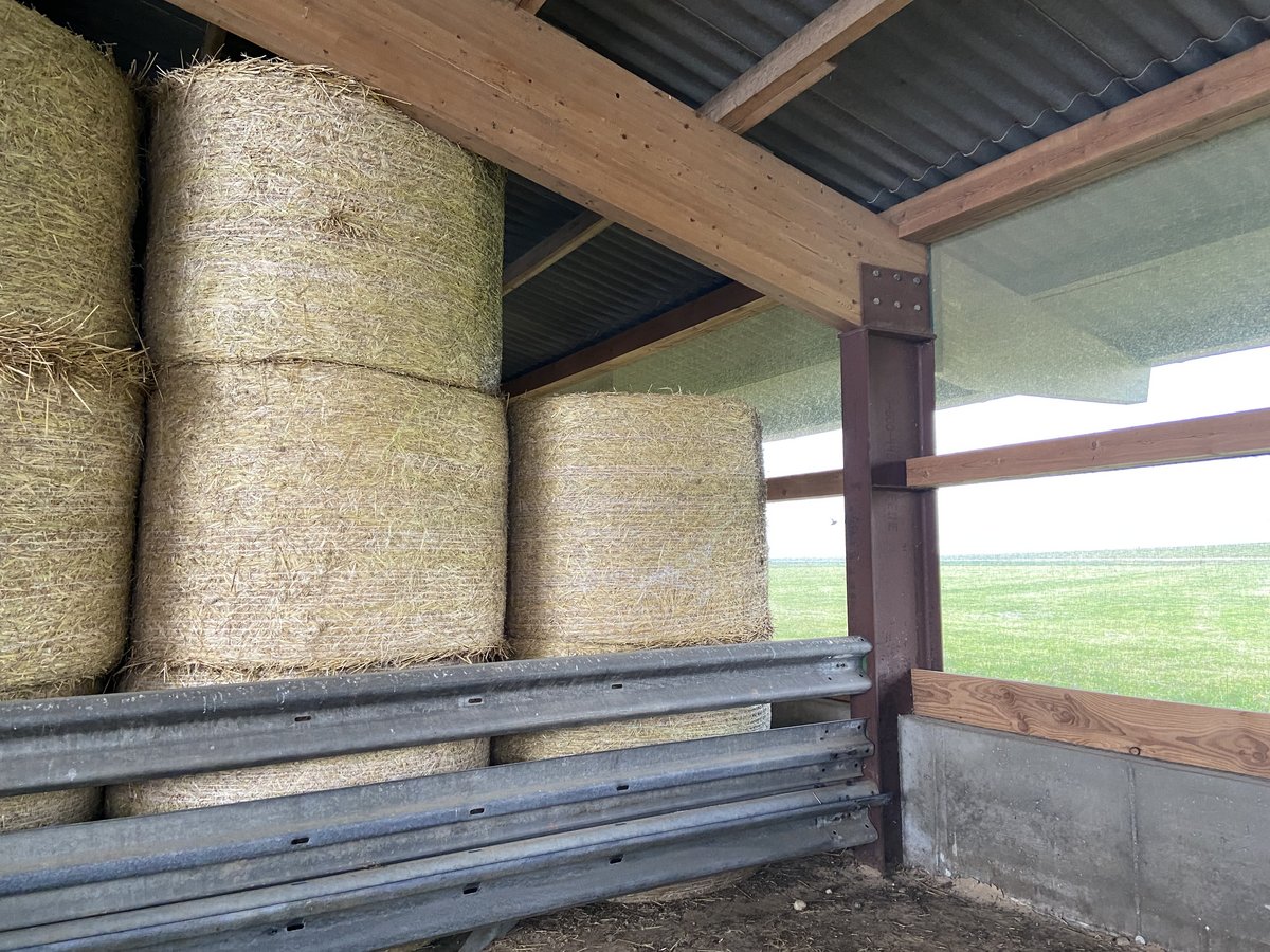 Bei der Lagerung von Heu und Stroh ist zu beachten, dass dies trocken und witterungsgeschützt geschieht.1 Geschlossene und gut belüftete Hallen mit festem Boden sind eine Ideallösung. Das Lagern von Heu und Stroh unter Vordächern bzw. die Lagerung an Gebäuden ist aus Brandschutzgründen nicht erlaubt. Als kostengünstige Neubauten eignen sich z. B. ein Ständergebäude mit Punktfundament und einem Untergrund aus Pflaster oder Schotter. Wird Mutterboden entnommen, können die Flächen mit Sand aufgeschüttet und mit Schotter bedeckt werden. Entscheidend ist, dass Wasser wie z. B. Regenwasser ablaufen kann und keine Feuchtigkeit von unten in die Ballen einzieht. Als günstige Tore bieten sich z. B. in Rahmen eingespannte Vogelschutznetze an. Die Seitenwände können mitunter aus Tropfblech, Faserzementplatten (Eternitplatten) oder Holz gebaut werden. Um Schlagregen vorzubeugen, eignen sich Windbrecher (Abb. 1). Werden die Ballen auf Paletten gelagert, kann der Feuchtigkeitseintrag von unten vermieden und die Belüftung der Ballen gefördert werden.2