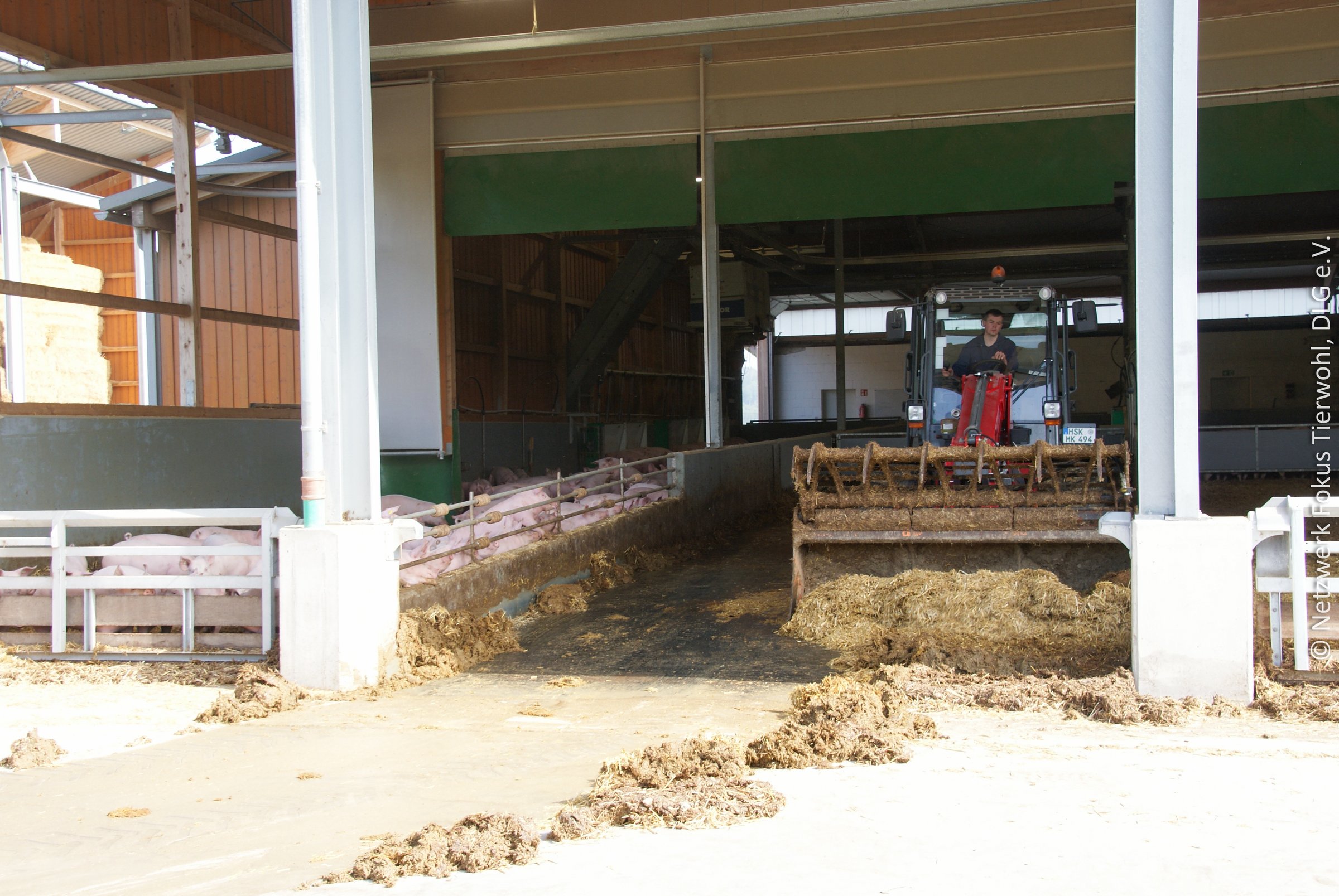 Das Tierwohl steht mehr denn je im Fokus und die Schweinehaltung im Wandel. Organisches Beschäftigungsmaterial gehört nun zum gesetzlichen Standard und strukturelle Entwicklungen führen zu mehr eingestreuten Schweineställen, zunehmend auch mit Ausläufen. Um den vermehrten Einsatz von Einstreu in der Praxis umsetzen zu können, sind auf den Betrieben ausreichend Lagermöglichkeiten für Heu und Stroh, geeignete Entmistungstechniken und auch eine fachgerechte Mistlagerung erforderlich. Dabei sind verschiedene Aspekte zu beachten, um eine gute Qualität von Heu und Stroh zu gewährleisten und Mist umweltgerecht zu lagern. Auch bei der Entmistung sollten verschiedene Punkte beachtet werden, die zum einen den Arbeitsalltag erleichtern und zum anderen die Umwelt schonen. Das Wichtigste hat die AG „Bauen: Sauen und Mast“ des Tierwohl-Kompetenzzentrums Schwein aus dem Netzwerk Fokus Tierwohl zusammengefasst.