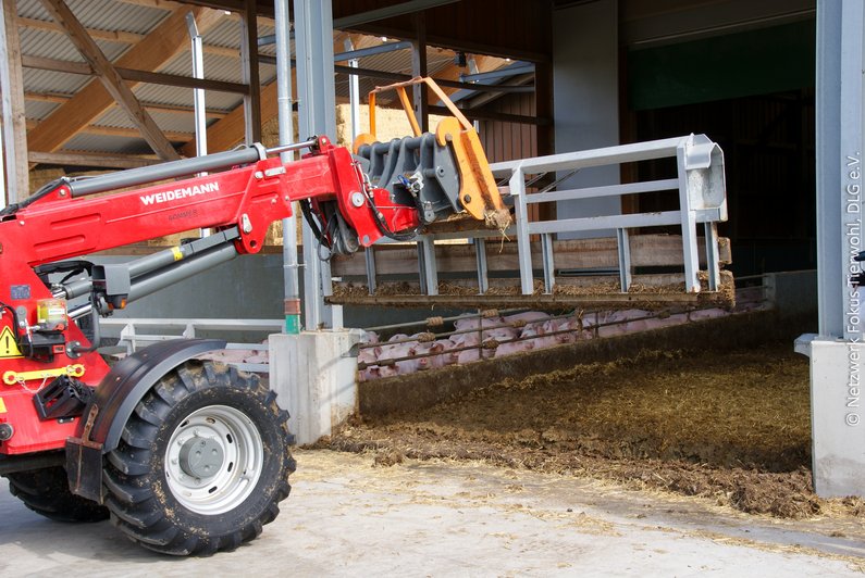Das Tierwohl steht mehr denn je im Fokus und die Schweinehaltung im Wandel. Organisches Beschäftigungsmaterial gehört nun zum gesetzlichen Standard und strukturelle Entwicklungen führen zu mehr eingestreuten Schweineställen, zunehmend auch mit Ausläufen. Um den vermehrten Einsatz von Einstreu in der Praxis umsetzen zu können, sind auf den Betrieben ausreichend Lagermöglichkeiten für Heu und Stroh, geeignete Entmistungstechniken und auch eine fachgerechte Mistlagerung erforderlich. Dabei sind verschiedene Aspekte zu beachten, um eine gute Qualität von Heu und Stroh zu gewährleisten und Mist umweltgerecht zu lagern. Auch bei der Entmistung sollten verschiedene Punkte beachtet werden, die zum einen den Arbeitsalltag erleichtern und zum anderen die Umwelt schonen. Das Wichtigste hat die AG „Bauen: Sauen und Mast“ des Tierwohl-Kompetenzzentrums Schwein aus dem Netzwerk Fokus Tierwohl zusammengefasst.